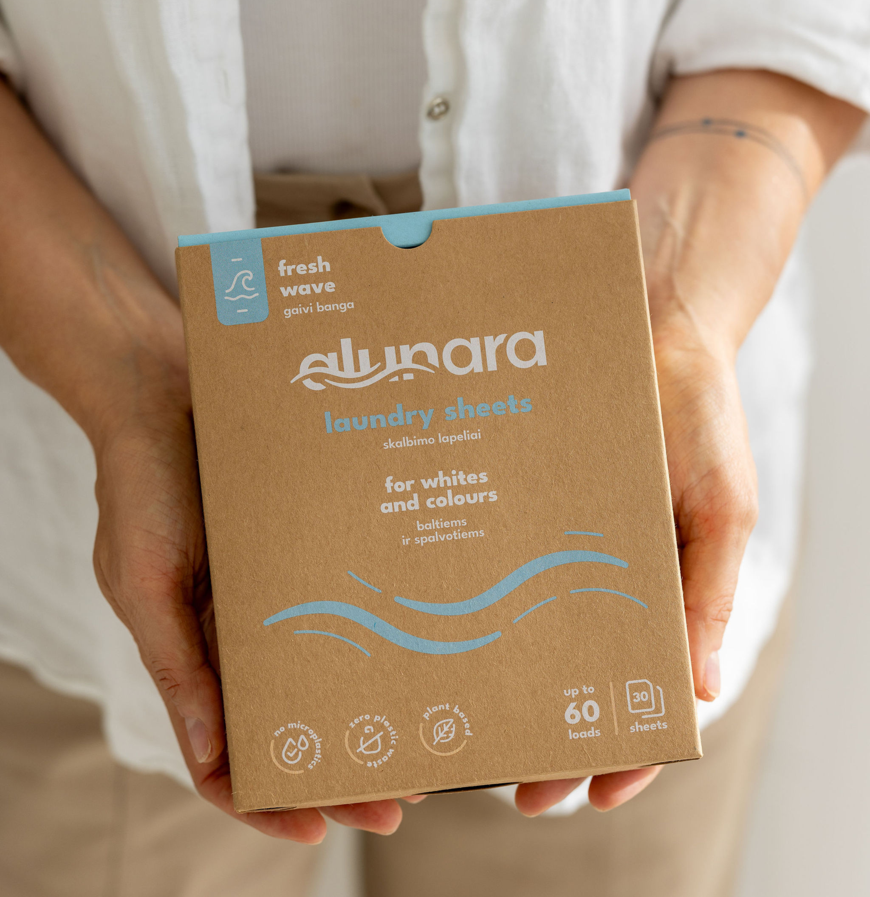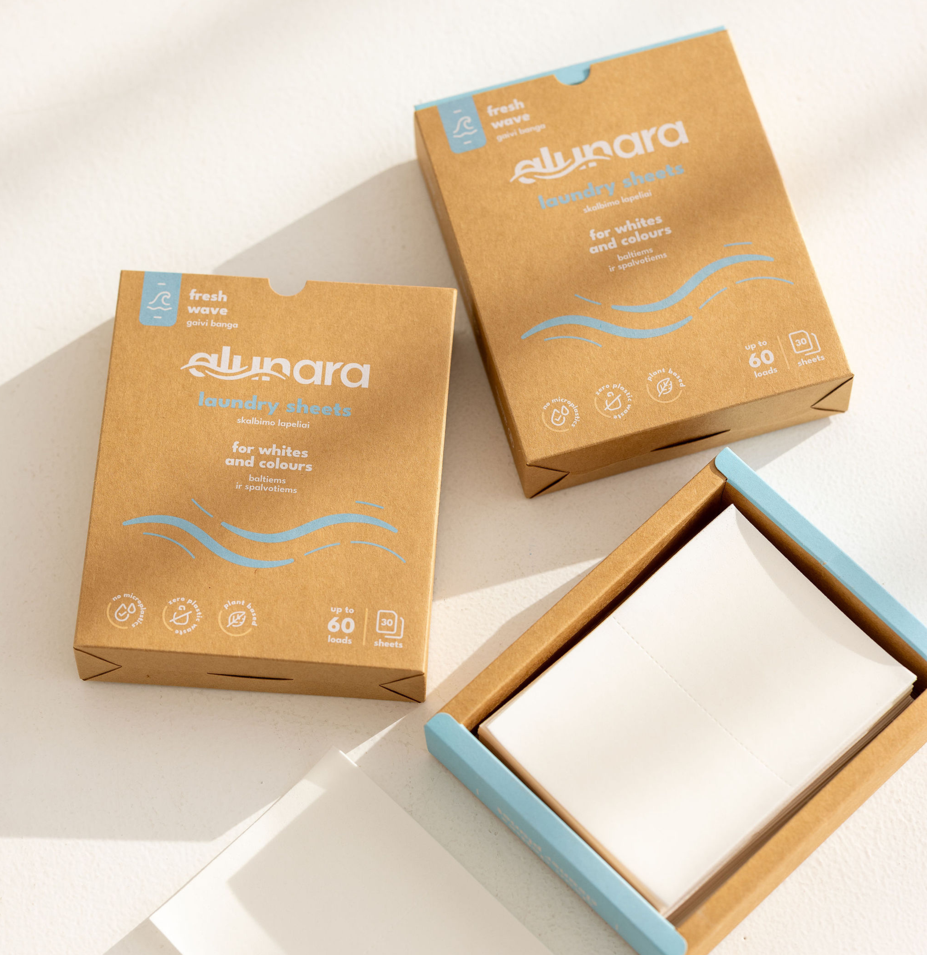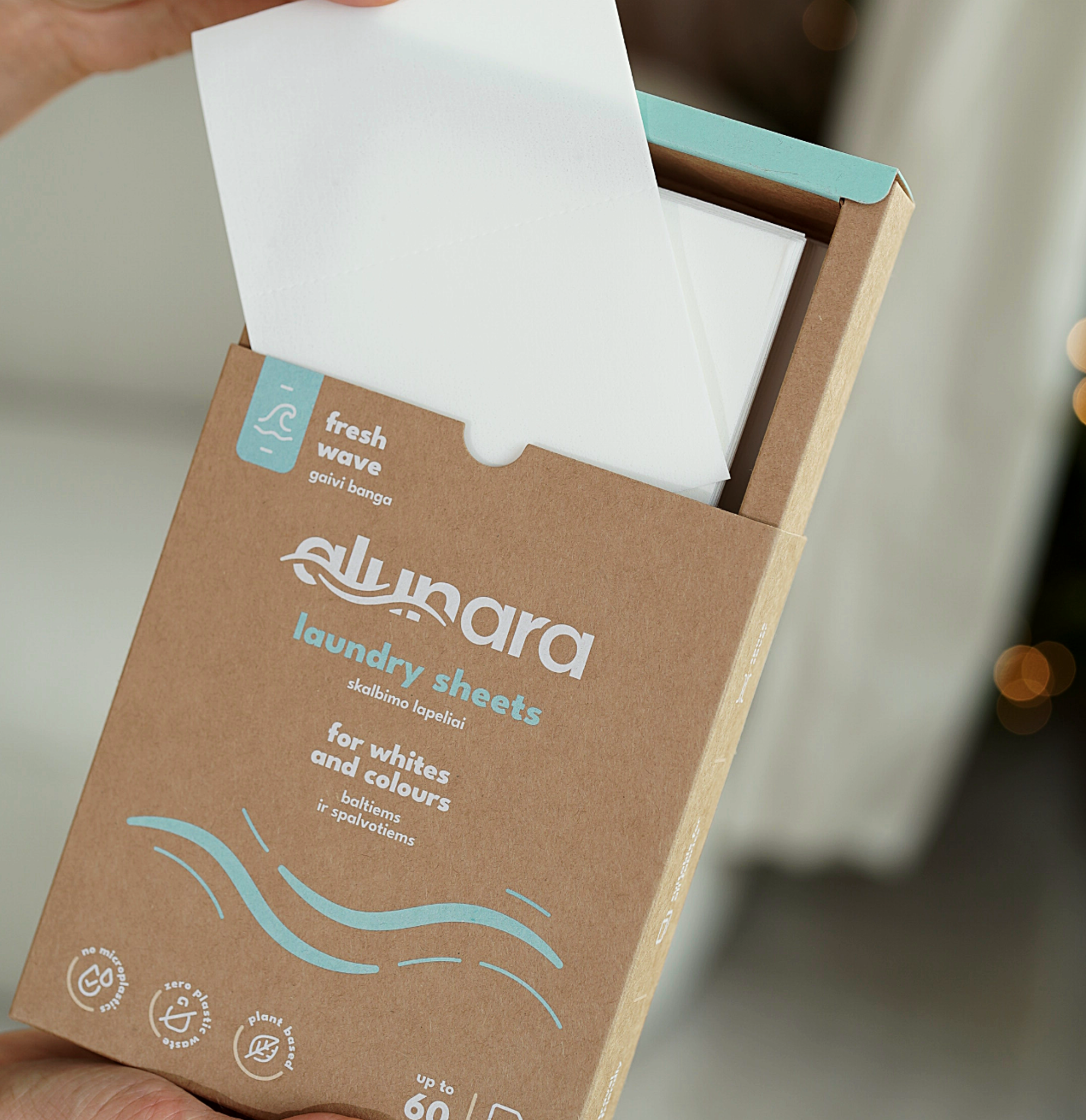 ALUNARA Fresh Wave Laundry Sheets bring sustainable simplicity to your laundry routine. Inspired by ocean waves, our plant-based formula dissolves instantly and tackles grease and stains on both white and coloured fabrics.